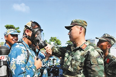 海南大學(xué)學(xué)生軍訓(xùn)現(xiàn)場,海口消防支隊(duì)消防官兵向?qū)W生教授消防器材的使用方法。??谑泄蚕乐ш?duì)供圖
